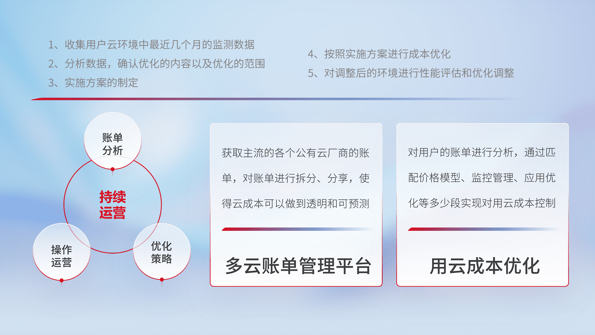通过多云纳管,,以统一的资源数据模型把客户的云资源进行抽象和封装,,,,进而实现对多云资源的统一操作,,保障云资源管理的可靠性、、、、稳定性与可用性。。。。量身定制化运维内容,,配置、、、、开发运维、、、、补丁管理、、备份、、监控、、、、认证和访问管理、、审计和日常巡检等,,保障在用云过程中的可靠度,,稳定度以及高可用率。。。