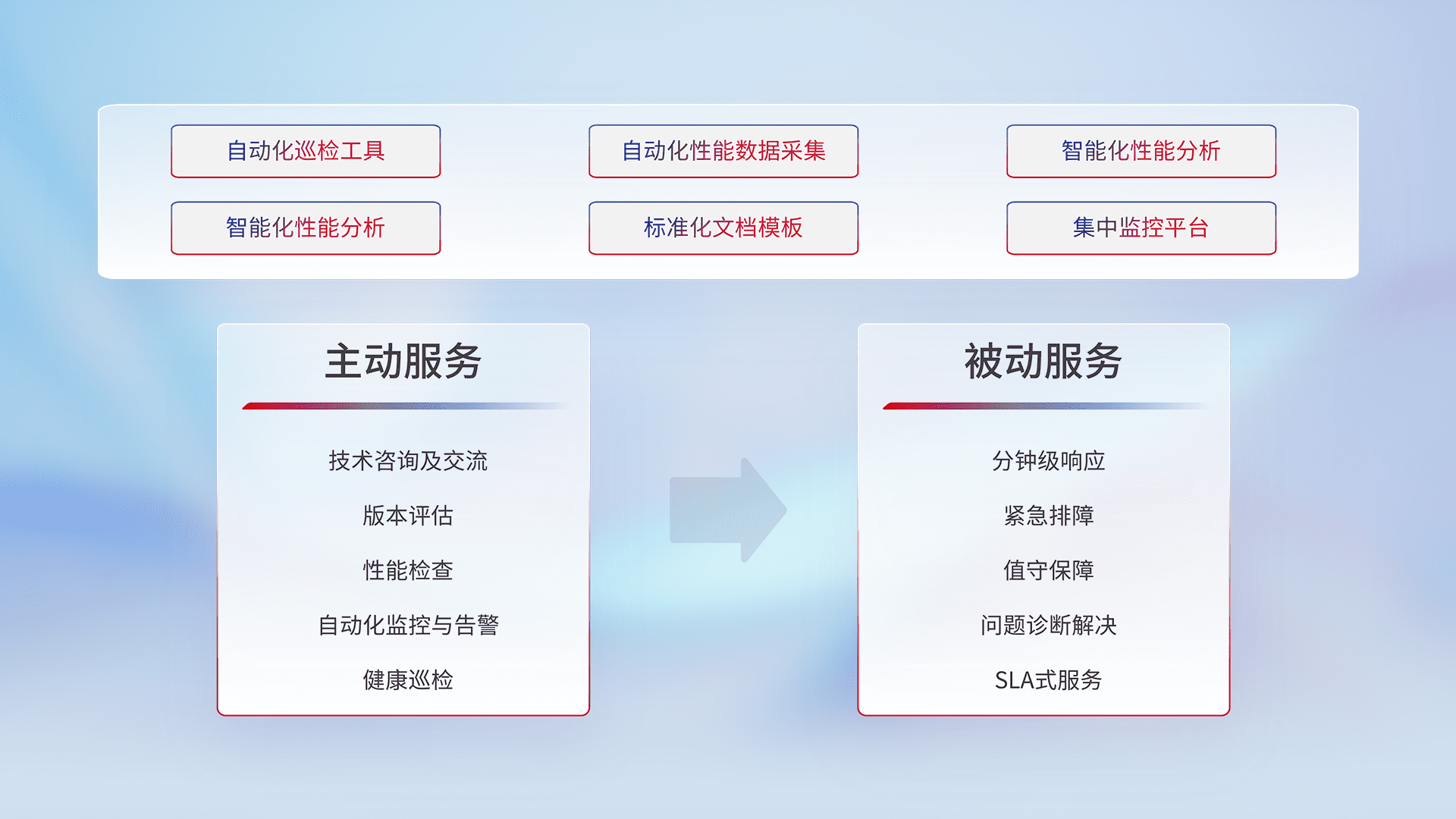 智能化工具和标准化文档,,,,保障服务质量,,,提供主动服务(包含技术咨询、、版本评估、、、、性能检查、、、、自动化监控与告警、、健康巡检)和被动服务包含(分钟级响应、、、、紧急排障、、、值守保障、、、、问题诊断解决、、、SLA服务)。。