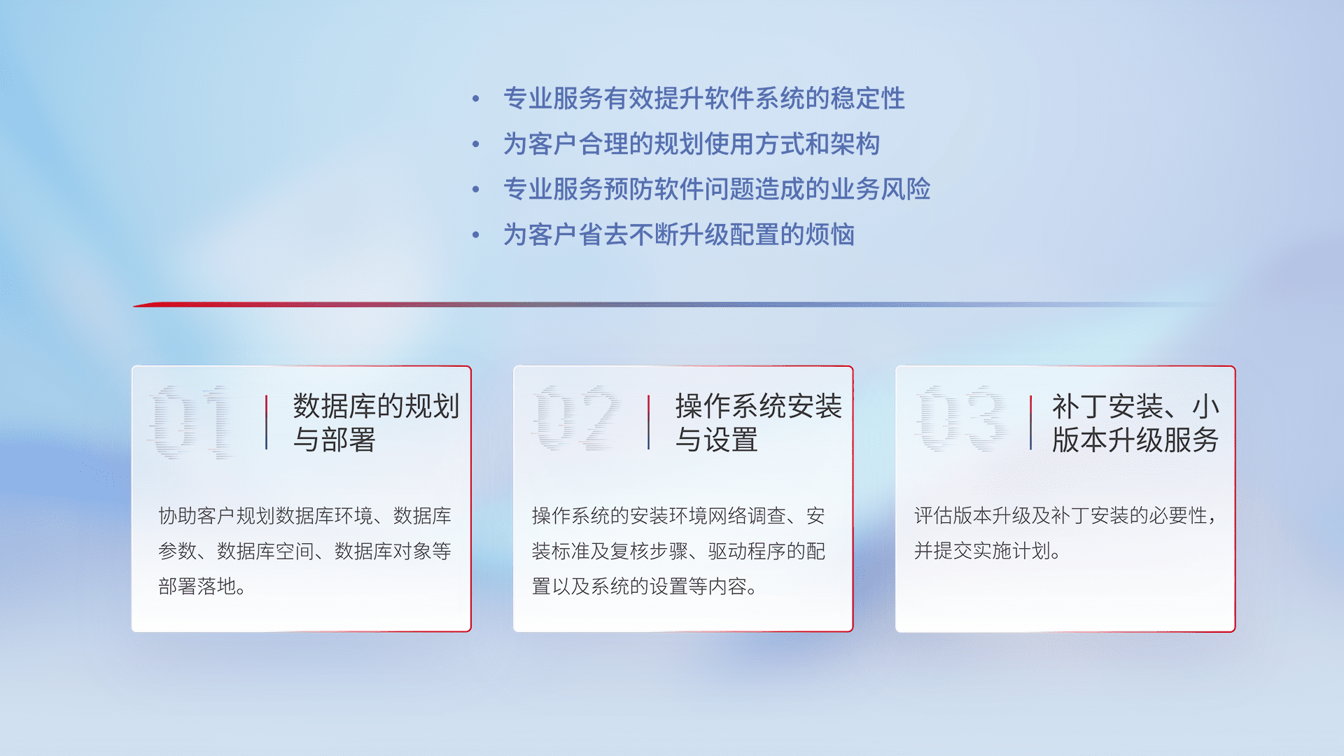 为客户提供软件规模升级、、、、快速部署、、、按需配置的专业服务,,,从数据库的规划与部署到操作系统的安装与设置,,,,再到补丁安装和小版本升级提供支持。。