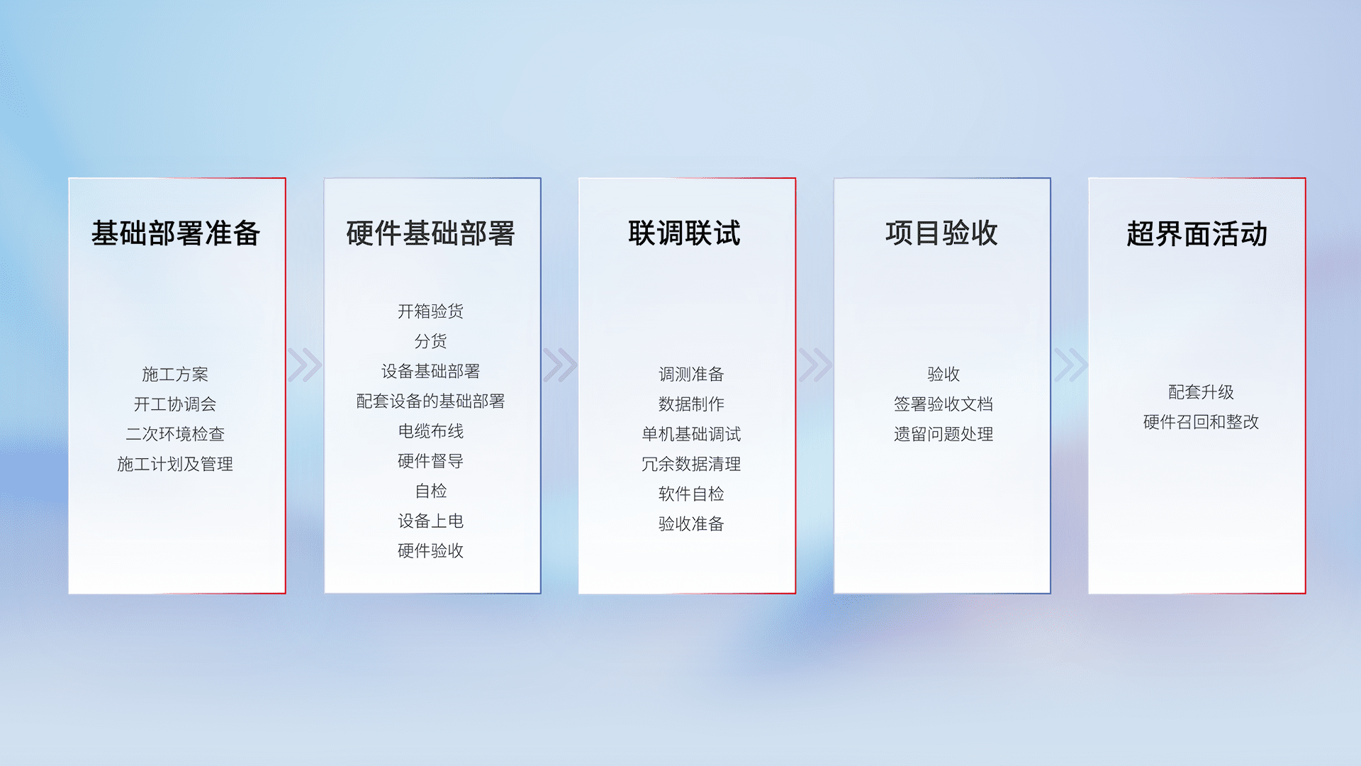 从基础部署准备、、硬件基础部署、、、、联调联试、、、项目验收、、、、越界面活动的全过程可追溯,,,,保证施工质量和进度。。。